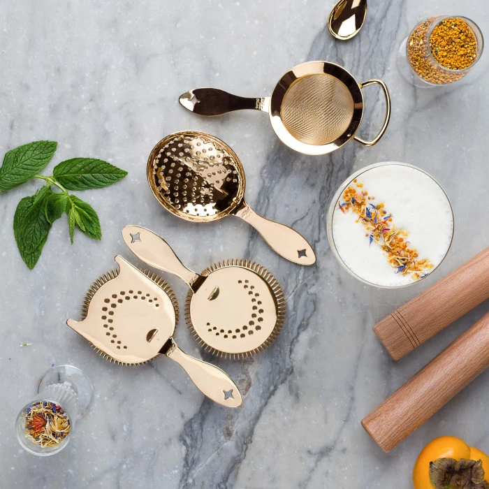 This Bonzer Heritage Strainers Set is for all cocktail straining needs. This features Heritage Fine Strainer, the Heritage Sprung Julep, a detached Heritage Julep, and a Heritage Hawthorn classic strainer. A wide variety of strainers, for a wide variety of cocktail masterpieces.