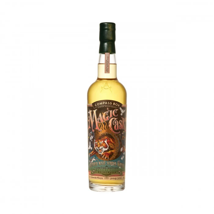 Magic Cask is a blended malt Scotch whisky from Compass Box, comprised mostly of whisky from the closed Imperial Distillery, drawn from first-fill bourbon barrels and blended with a younger Speyside whisky which was re-racked into Oloroso-seasoned butt casks. After sampling them three years later, the team at Compass Box were so fascinated that they began more experimentation, leading to the Magic Cask! This expression was bottled in March 2020 at46% abv without chill-filtration or added colouring, with just 5,538 bottles produced.