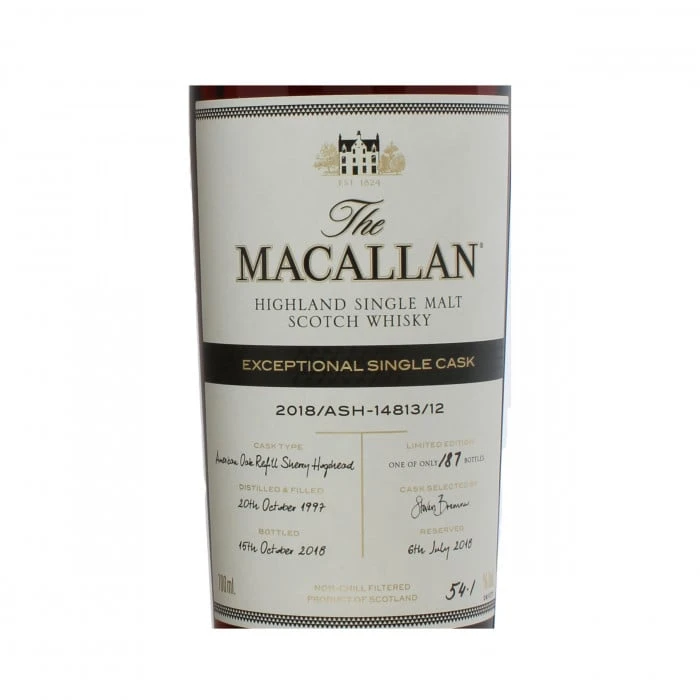 An impressive, rare bottle from The Macallan’s Exceptional Single Cask series. This expression was distilled in October 1997 and matured until 2018 in an American oak refill sherry hogshead before being bottled at a natural cask strength of 54.1% abv. Just 187 bottles were produced.