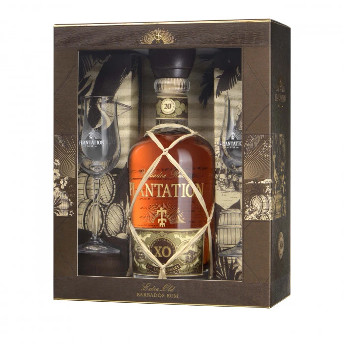 An anniversary to remember. This gift set presents a bottle of Plantation Extra Old rum, styled in the shape of a decanter, with two elegant tasting glasses. This Barbados rum is aged tropically in bourbon casks, but the story with this EO doesn’t end there. It is then shipped to Charente, France, where it undergoes a second maturation in small French oak casks. Arriving in a splendidly detailed gift box, this is a gift set that is just waiting to be cracked into.