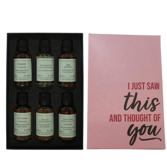 The perfect gift to show the whisky lover in your life how much you really care. This thoughtful gift set includes the Benrinnes 15 Year Old, The Loch Fyne Chocolate & Orange Liqueur, Jura Seven Wood, Fettercairn 12 Year Old, Caol Ila Distillers Edition, and The Dalmore Sherry Cask Select 12 Year Old.
