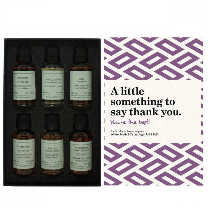 Show your gratitude in the best of ways, with this lovely gift pack of six 3cl tasting whiskies. It features some the very best expressions from every corner of Scotland: